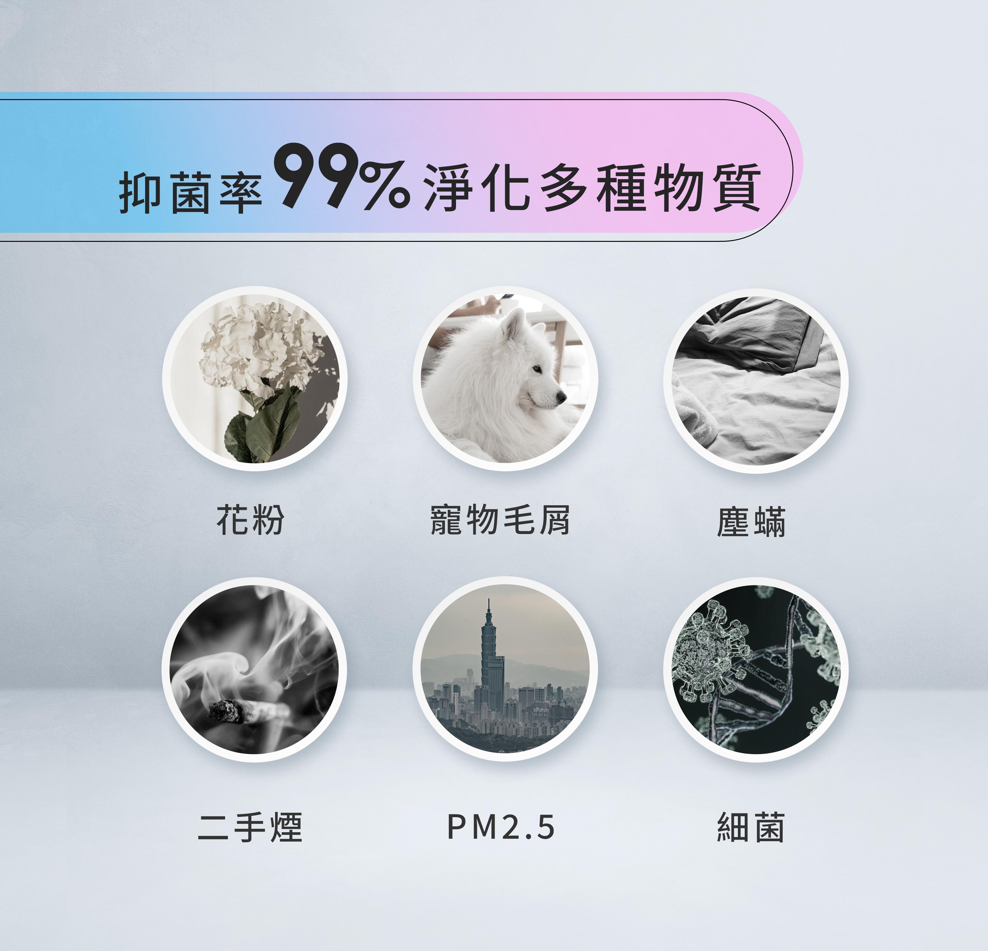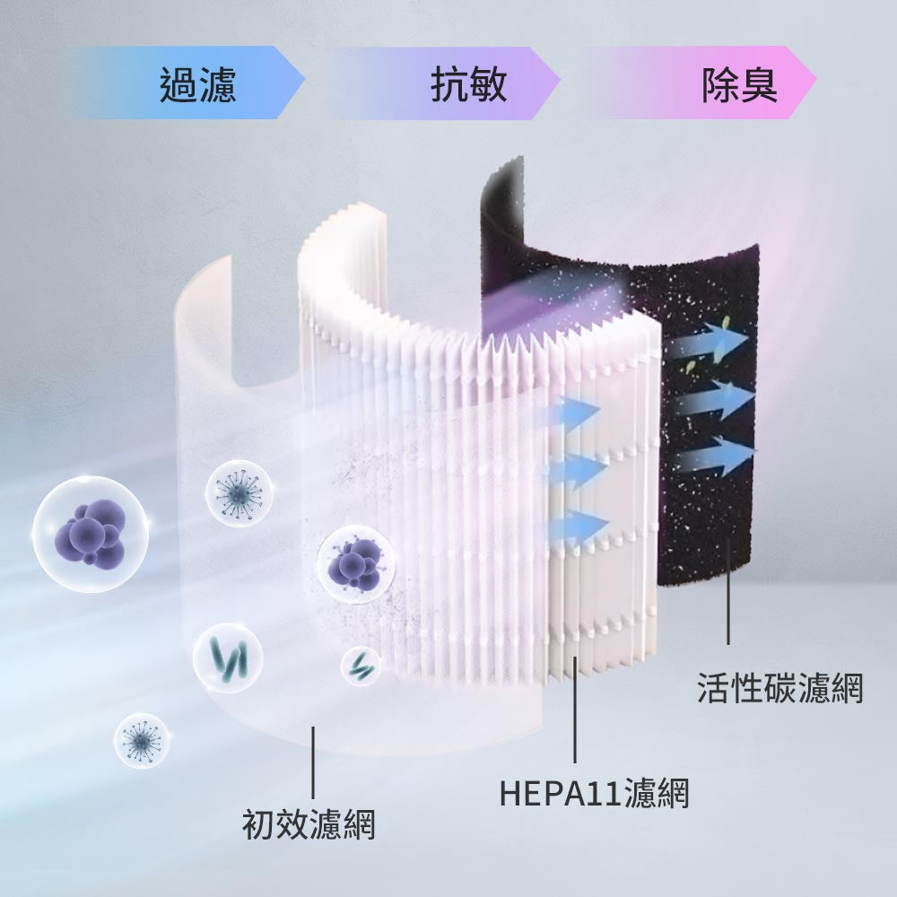 3層全方位過濾,層層把關空氣品質,過濾空氣中99%的灰塵毛髮、PM2.5、花粉、細菌、病毒等,並有效去除異味、甲醛,有效清新空氣。